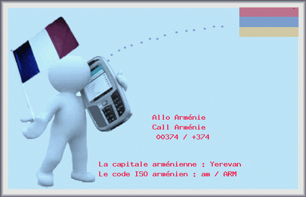 A savoir que le l'indicatif international 374 est requis uniquement pour téléphoner de l'étranger vers l'Arménie. En ce qui concerne les appels nationaux émis sur le sol arménien, il n'est pas nécessaire de composer l'indicatif pays 374. Enfin, pour appeler votre correspondant en Arménie depuis un pays à l'étranger, saisir d'abord le préfixe de sortie qui prend une des formes suivantes : 00 / 011 / 810 et le signe "+" pour les appels depuis le téléphone portable. Voici les formules possibles : 00374 / 810 374 / 011 374 / +374.
